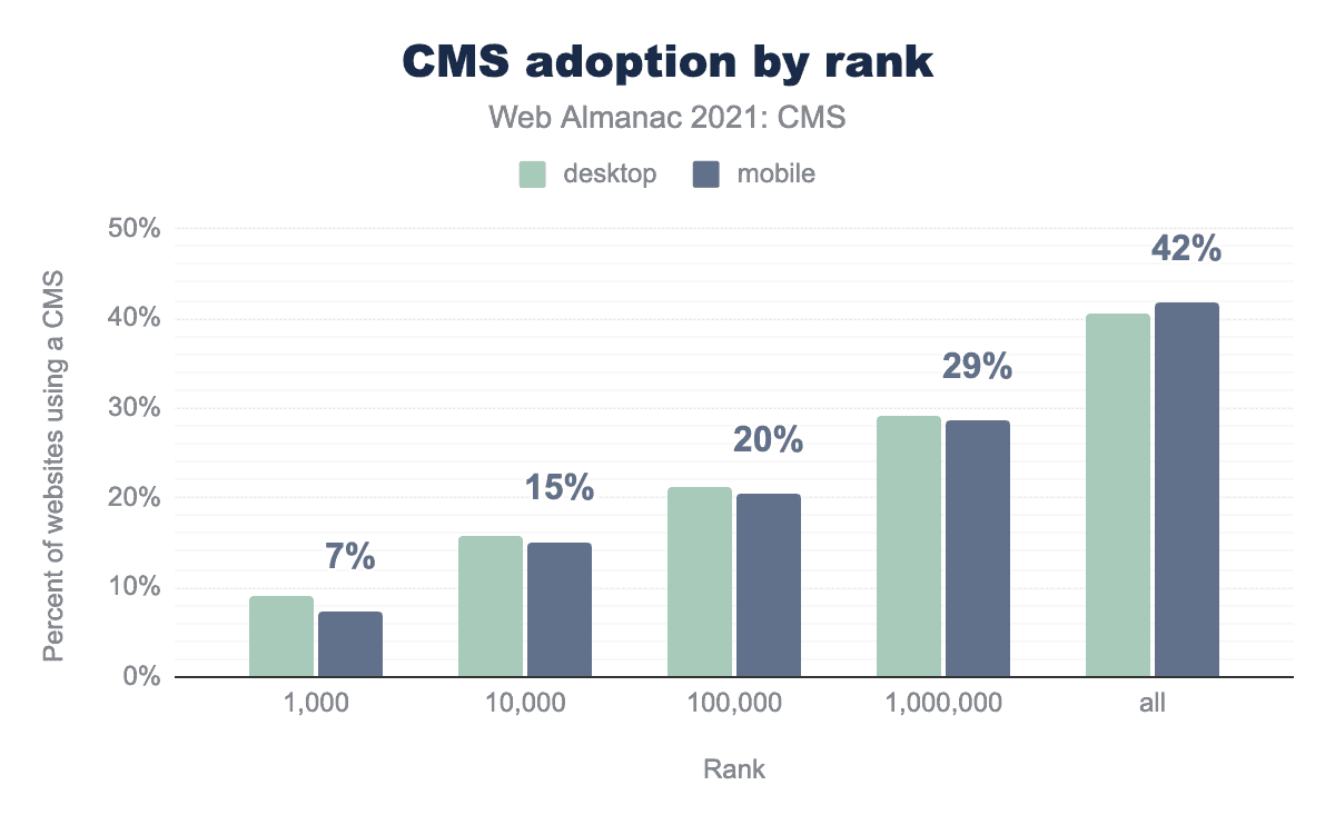 「すべて」のグループでは42%のページ(モバイル)がCMSを使用しているのに対し、上位1,000サイトでは7%の導入にとどまっています。