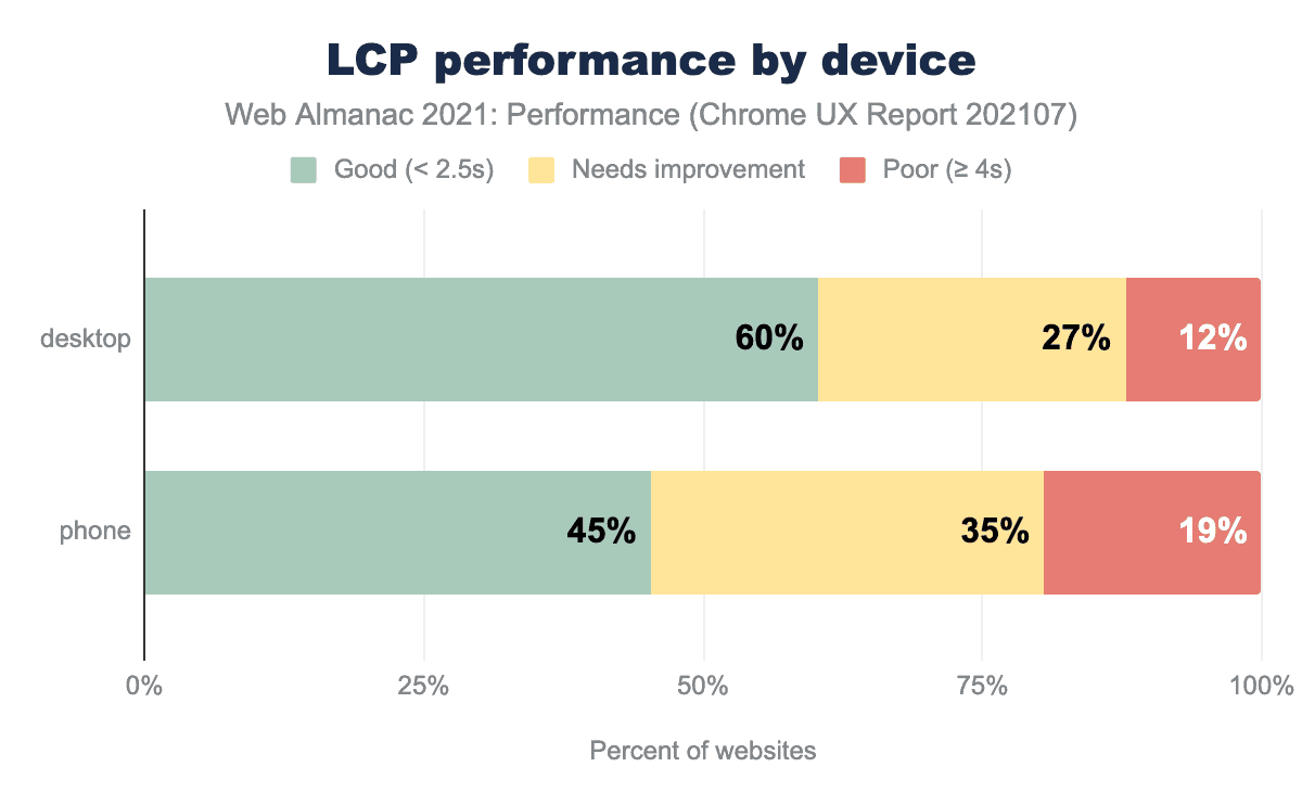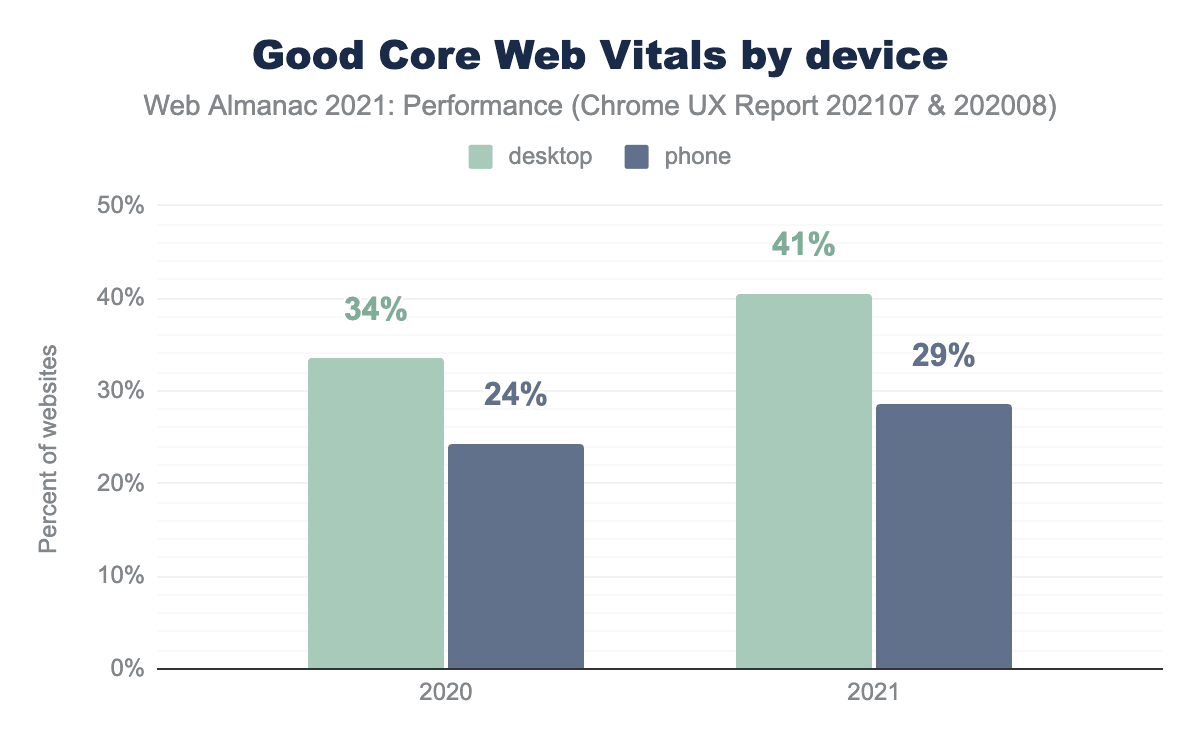 例年通り、モバイル端末よりもデスクトップマシンの方が、パフォーマンスが高いという結果になりました。このため、実際のモバイル端末でサイトのパフォーマンスをテストし、実際のユーザー指標(つまり、フィールドデータ)を測定することが非常に重要です。開発者向けツールでモバイルをエミュレートすることは、研究室(=開発)では便利ですが、実際のユーザー体験を代表するものではありません。