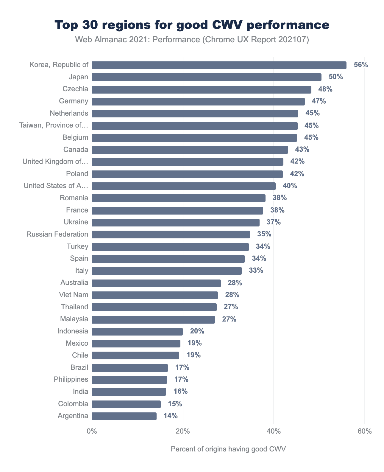 アジアやヨーロッパの一部の地域は、引き続き高いパフォーマンスを示しています。これは、ネットワークの速度が速いこと、より高速なデバイスを持つ裕福な人口が多いこと、エッジキャッシュの位置が、近いことが原因であると考えられます。多くの結論を出す前に、このデータセットをもっと理解する必要があります。