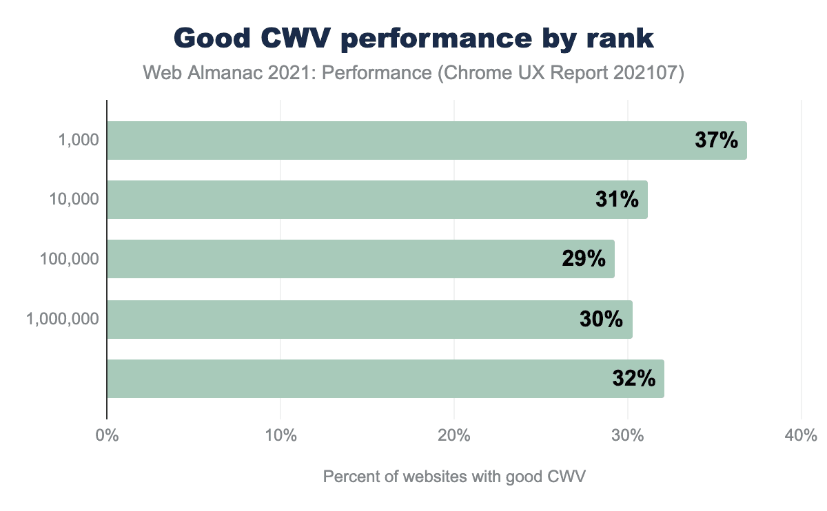 Core Web Vitalsでは、上位1,000サイトが他を大きく引き離している。グラフの真ん中には、CLSに起因するパフォーマンスの低下という興味深い谷が発生しています。FIDはすべてのグループ化で横ばいでした。他のすべての指標は、上位のランキングほど高いパフォーマンスを示すという相関関係にあります。