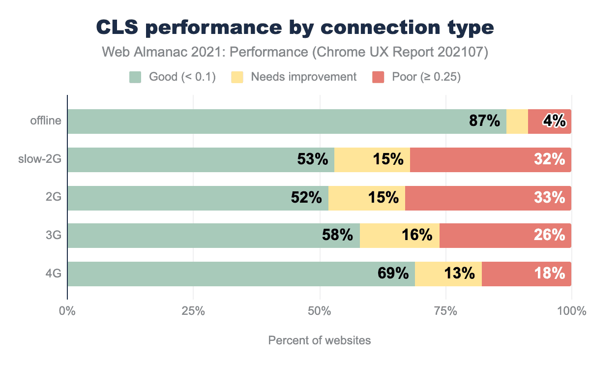 オフラインのウェブサイトは、すべての接続タイプの中でもっとも高いCLSパフォーマンスを示しました。サービスワーカーキャッシングを使用しているサイトでは、レイアウトシフトの原因となる画像や広告などの一部のアセットでキャッシュされない場合があります。そのため、これらのアセットは読み込まれず、レイアウトシフトを引き起こすことはありません。このようなサイトのフォールバックHTMLは、オンラインウェブサイトのより基本的なバージョンになることがよくあります。