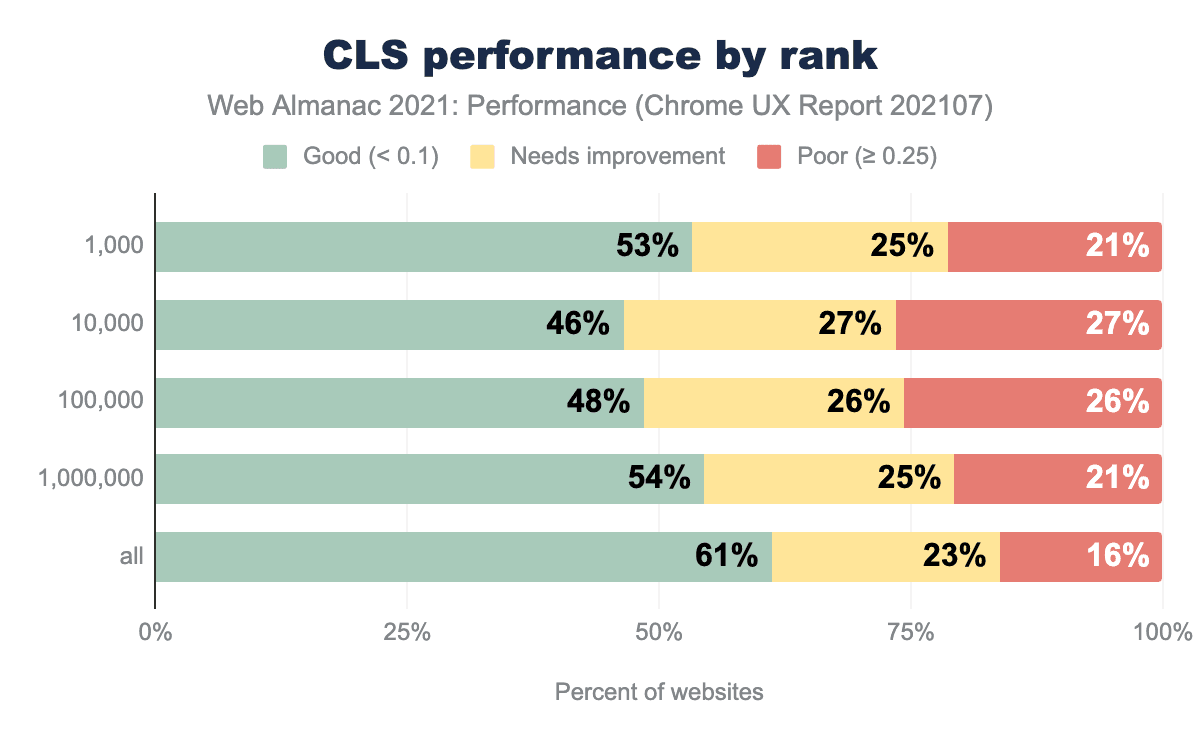 ランキングについては、CLSのパフォーマンスは、上位10,000サイトで興味深い谷を示しました。また、1M以上のランキンググループは、1M未満のランキングサイトよりもパフォーマンスが低下しています。「all」グループは、他のすべてのランク付けされたグループよりもパフォーマンスが良かったので、1M以下のグループのパフォーマンスが向上しています。WordPressを使ったオリジンの60%が良いCLSを経験したことから、WordPressが再びこれに関与していると思われます。