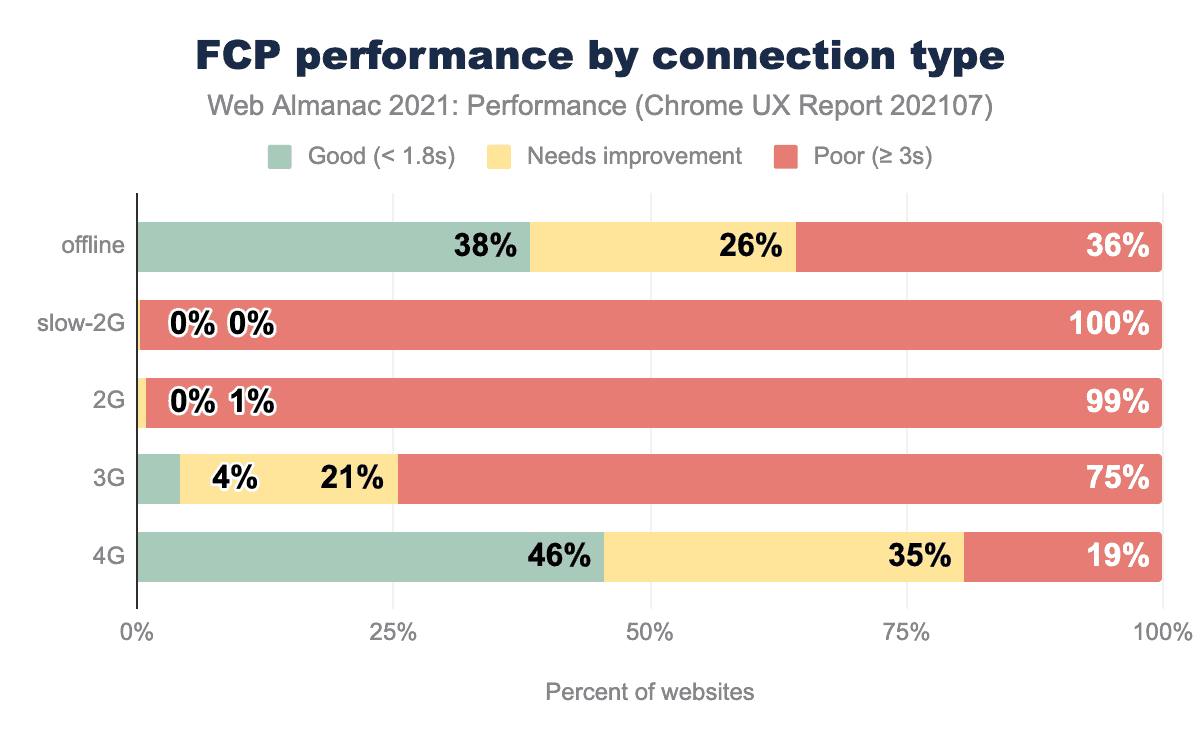 LCPが良好なオフラインの起点は、4Gの体験とより密接に一致していますが、LCPが悪い体験はオフラインの方が高いのです。LCPはFCPの後に発生し、0.7秒の追加予算があるため、FCPよりもオフラインのウェブサイトの方が良いLCPを達成した可能性があります。