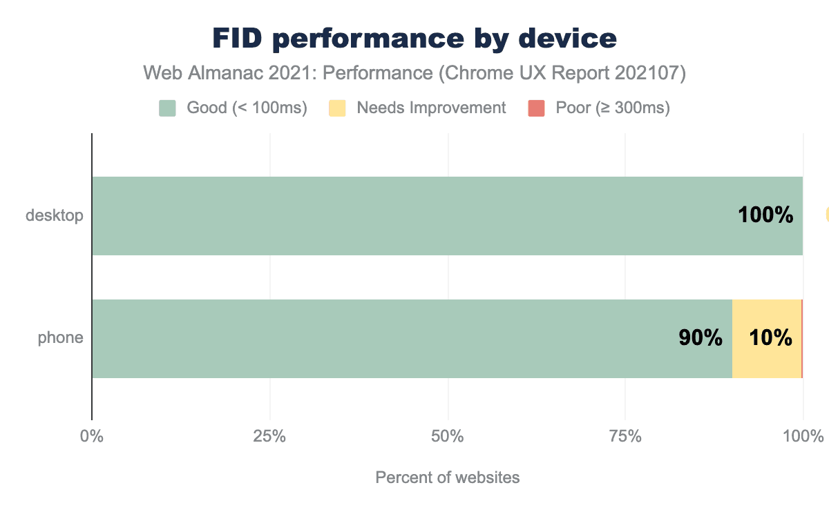 FIDのパフォーマンスは、モバイル端末よりもデスクトップ端末の方が優れており、これは、より大量のJavaScriptを処理できる端末のスピードが速いためと思われます。