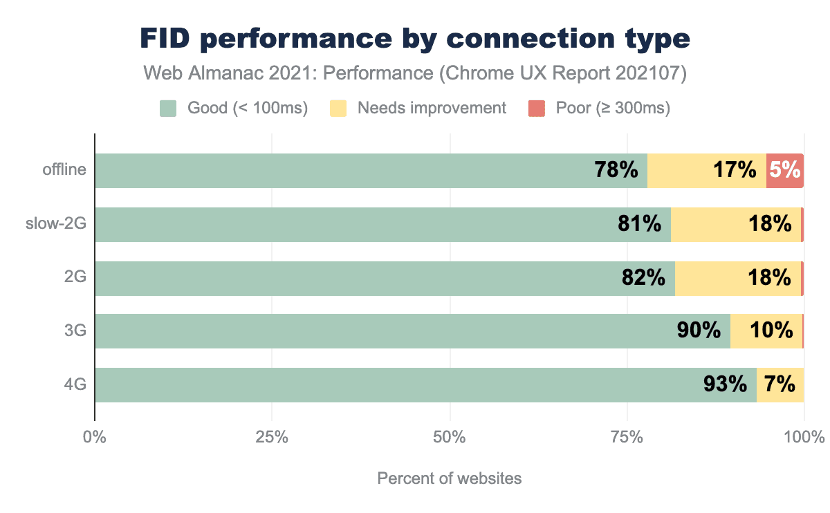 他の指標とは異なり、オフラインのウェブサイトでは、他の接続カテゴリーよりもFIDが悪化していました。これは、サービスワーカーを持つ多くのウェブサイトがより複雑な性質を持つためと思われます。サービスワーカーがあっても、メインスレッドで実行されるクライアントサイドのJavaScriptの影響がなくなるわけではありません。