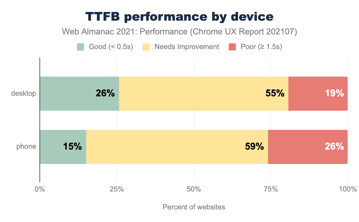 TTFBはモバイルよりもデスクトップの方が高速であり、これはネットワーク速度が速いためと思われる。昨年と比較すると、TTFBはデスクトップでわずかに改善し、モバイルで遅くなった。