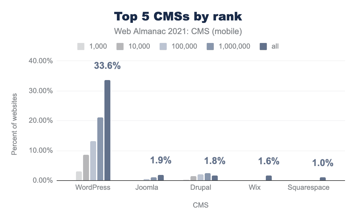 次に、上位5つのCMSを順位別に見ると、WordPressが「全ページ」の33.6%を占め、もっとも導入が進んでいることがわかります。