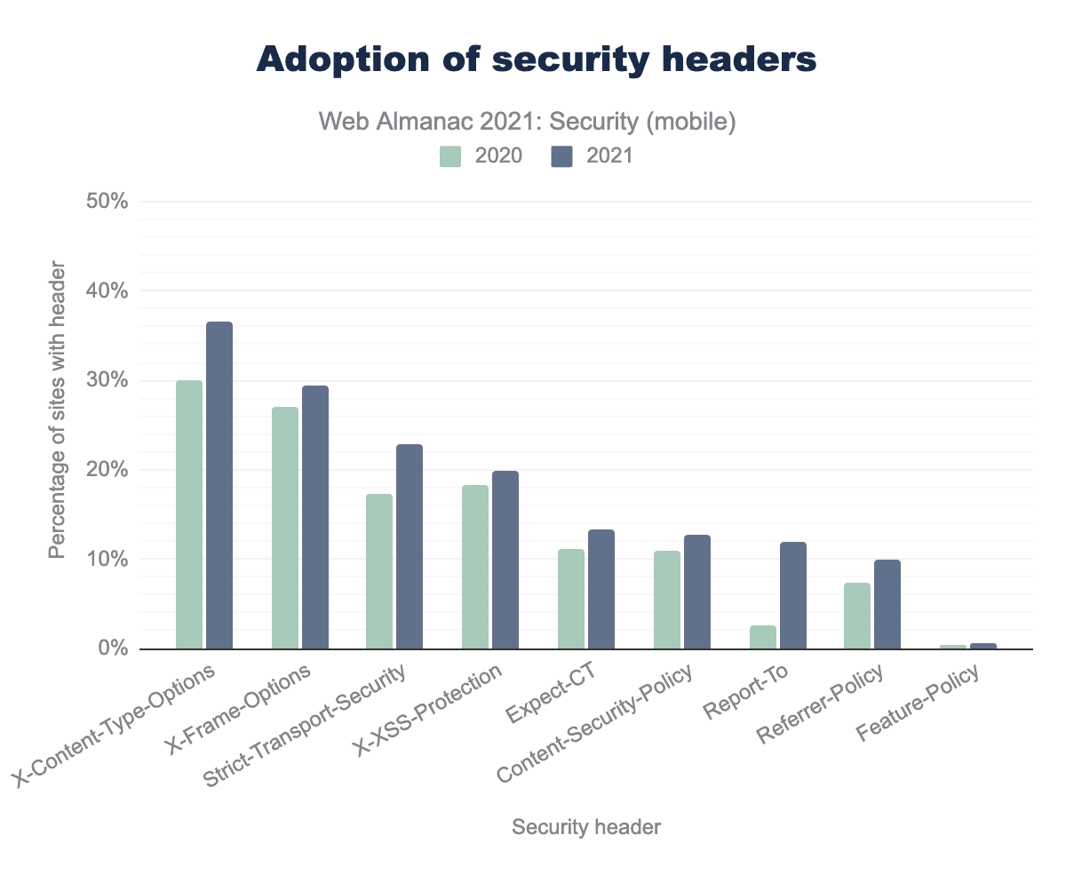 これらの増加は、私たちがより安全なウェブ環境に移行していることを示していますが、今日の私たちのウェブが十分に安全であることを意味するものではありません。まだまだ改善しなければならないことがあります。たとえば、私たちは、ウェブコミュニティがセキュリティヘッダーをもっと重視すべきであると考えています。これらは、ウェブ環境やユーザーを攻撃から守るために非常に有効な拡張機能です。