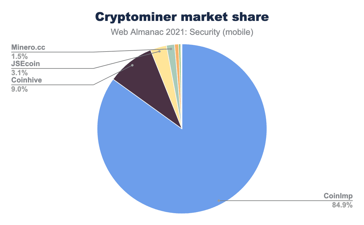 Coinhiveは、CoinImpに抜かれ、クリプトマイニングサービスの主流となったことがわかります。その大きな理由のひとつが、2019年3月にCoinhiveが閉鎖されたことです。興味深いことに、このドメインは現在Troy Huntによって所有されており、Coinhiveスクリプトをまだホストしているサイト(デスクトップ: 5.7%, モバイル: 9.0%)に、しばしば彼らの知らないところでホストしていることを意識させようとウェブサイトに積極的にバナーを表示させているのだそうです。これは、Coinhiveのスクリプトが運営停止から2年以上経過しても普及していることと、サードパーティーのリソースが運営停止になった場合、引き継がれる可能性があることを反映しています。Coinhiveの消滅により、CoinImpは明らかに市場リーダー(シェア84.9%)となった。