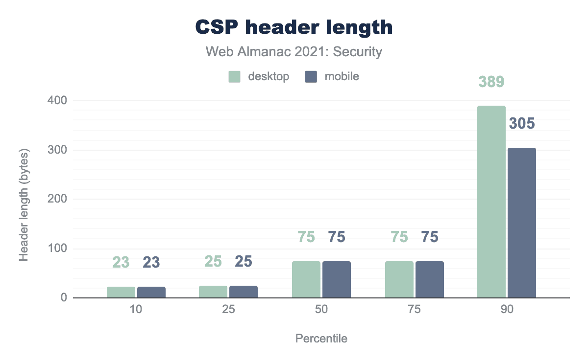 CSPヘッダーの長さの中央値は75バイトと、かなり短い状態が続いています。ほとんどのWebサイトでは、長い厳密なCSPの代わりに、特定の目的のために単一のディレクティブがまだ使用されています。たとえば、24.2%のウェブサイトは upgrade-insecure-requests ディレクティブのみを持っています。