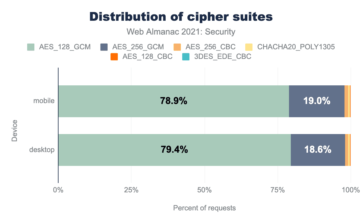 AES_128_GCM で、デスクトップサイトの79.4%とモバイルサイトの78.9%で使用されており、AES_256_GCM はデスクトップサイトの18.6% とモバイルサイトの19.0% 、AES_256_CBCは1.1%、モバイル用サイトの1.2%、CHACHA20_POLY1305はそれぞれ0.6%、0.7%、AES_128_CBCがそれぞれ0.3%、0.2%、3DES_EDE_CBCは非常に少数のサイトで使われているため0%と表示されます。AES_128_GCMは、デスクトップで79.4%、モバイルで78.9%と、依然としてもっとも広く利用されている暗号スイートです。AES_128_GCMは、暗号化と復号化にキーサイズ128ビットのAdvanced Encryption Standard (AES) とGCM暗号モードを使用することを表しています。128ビットの鍵はまだ安全だと考えられていますが、ブルートフォース攻撃により長く耐えられるように、256ビットの鍵が徐々に業界標準になりつつあります。