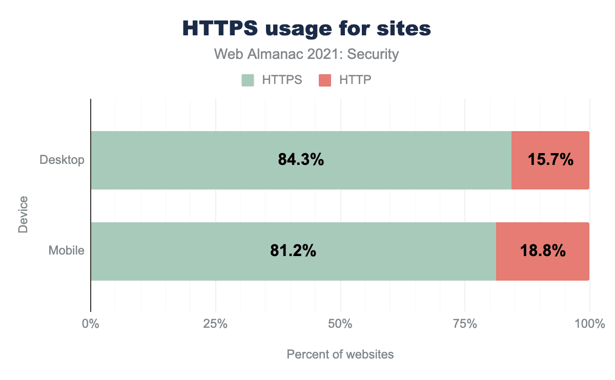HTTPSを使用しているサイトは継続的に改善しています(昨年から約7-8% の増加)。しかし、ブラウザがデフォルトでHTTPS専用モードを採用し始めると、まもなく多くのメンテナンスされていないウェブサイトが警告を表示し始めるかもしれません。