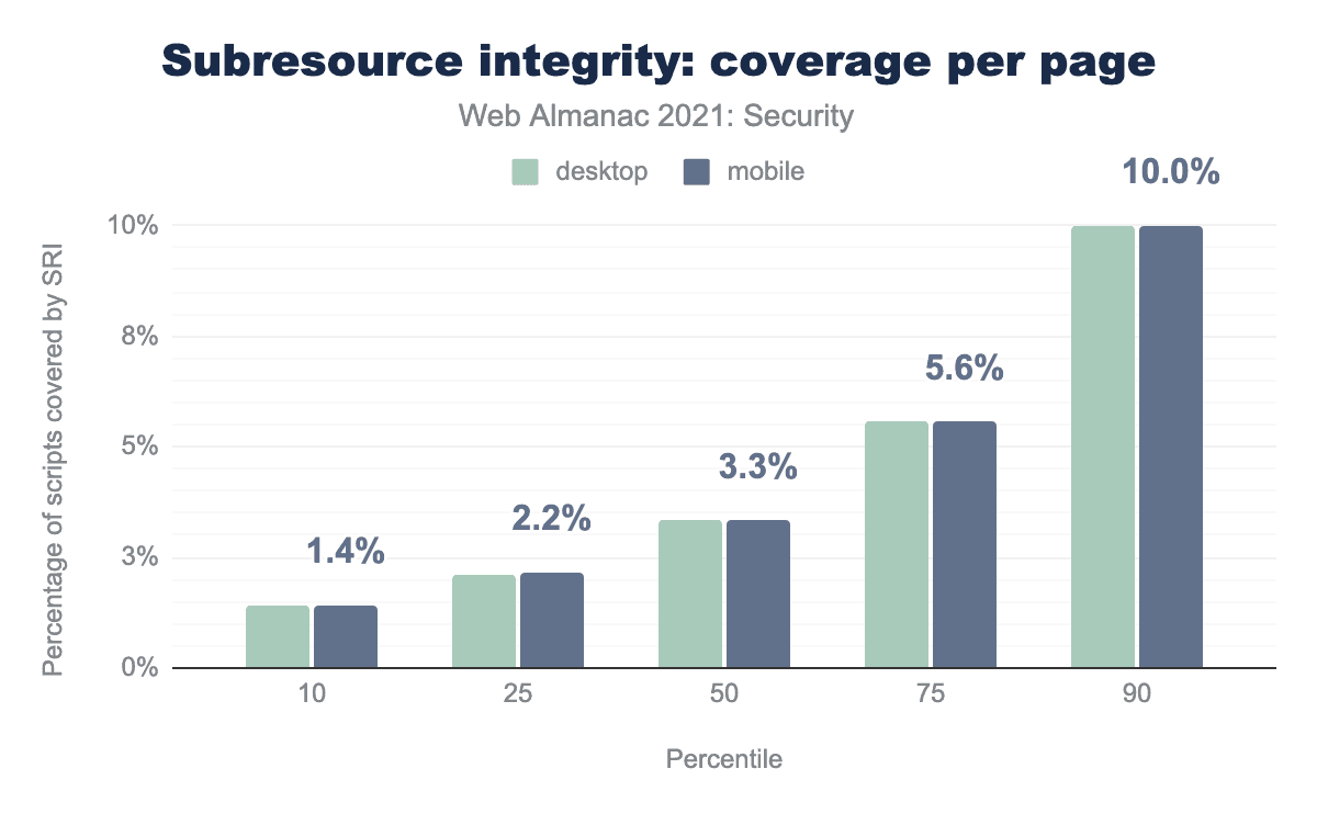 upgrade-insecure-requestsがデスクトップで57.6%、モバイルでは57.1%ともっとも多く、次いでframe-ancestorsがデスクトップで54.4%、モバイルでは55.8%となっています。block-all-mixed-contentはデスクトップで29.9%、モバイルでは30.7%、default-srcはデスクトップで18.4%、モバイルでは16.8%、 script-src はデスクトップで17.2%、モバイルでは16.7%、 style-src はデスクトップで13.8% 、モバイルで12.7%です。 また、 img-src はデスクトップで11.8%、モバイルでは10.4% 、 font-src はデスクトップで9.8%、モバイルでは8.2%、 object-src はデスクトップで8.3%、モバイルでは8.9%、 connect-src はデスクトップで8.5%、モバイルでは7.2% です。モバイル向けホームページでは、昨年の7.2%から9.3%がCSPを使用しており、ますます多くのウェブサイトがCSPを使用し始めていることがわかります。upgrade-insecure-requestsは、引き続きもっとも頻繁に使用されているCSPです。このポリシーの採用率が高いのは、昨年と同じ理由によるものと思われます。これは簡単でリスクの少ないポリシーで、すべてのHTTPリクエストをHTTPSへアップグレードするのに役立ち、またページで使用されている混合コンテンツをブロックするのにも役に立ちます。frame-ancestorsは、ページを埋め込むことができる有効な親を定義するのを助ける、僅差で2番目のものです。