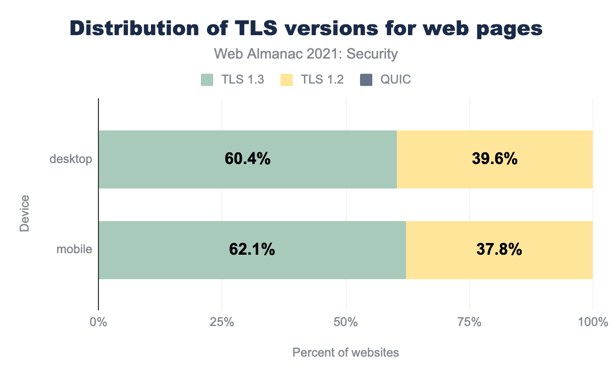 最近の暗号スイートはほとんどすべてフォワードセキュリティー鍵交換をサポートしています。つまり、サーバーの鍵が漏洩した場合、その鍵を使った古いトラフィックは復号化できないのです。デスクトップで96.6%、モバイルでは96.8%が前方秘匿を使用しています。TLSv1.2ではオプションだったフォワードセキュリティーが、TLSv1.3では必須となったことも、より安全である理由の1つです。