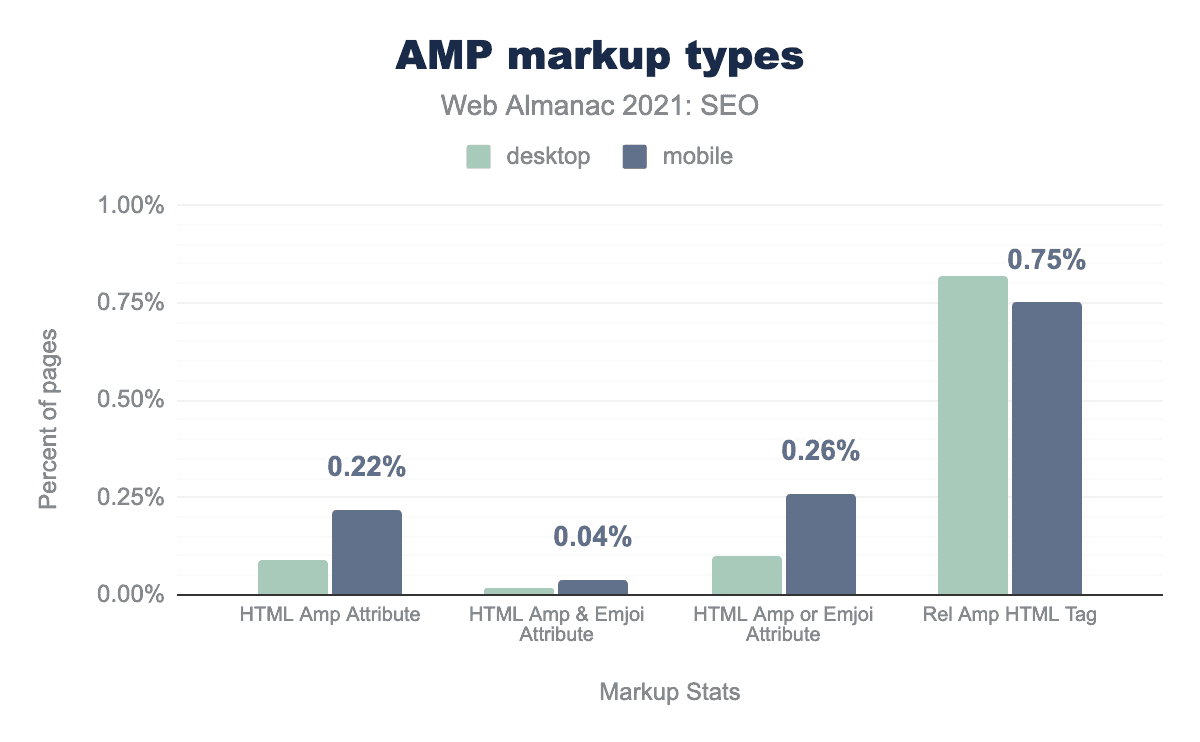 しかし、2021年になってもAMPの採用は増え続けている。現在、デスクトップページの0.09%にAMP属性が含まれているのに対し、モバイルページは0.22%となっています。これは、2020年のデスクトップページの0.06%、モバイルページの0.15%から上昇したものです。