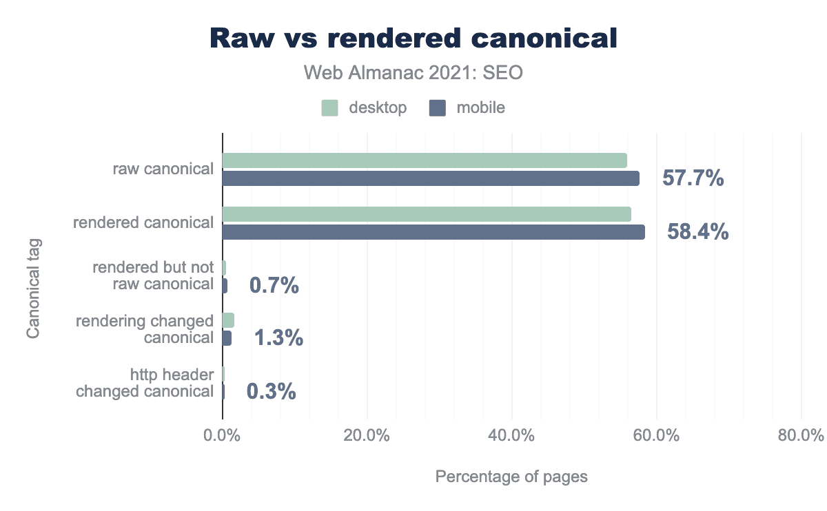昨年の章では次のように指摘しています “実装方法の違いでも同様の衝突が見られ、モバイルページの0.15%、デスクトップページの0.17%が、HTTPヘッダーとHTMLヘッドを介して実装したcanonicalタグの衝突を示しました”。