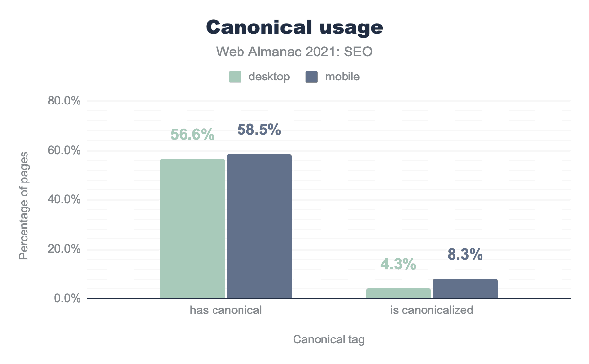 このデータでは、年々canonicalタグの導入が進んでいることがわかります。たとえば、2019年版では、48.3%のモバイルページがcanonicalタグを使用していたことがわかります。2020年版では53.6%に増え、2021年版では58.5%となっています。