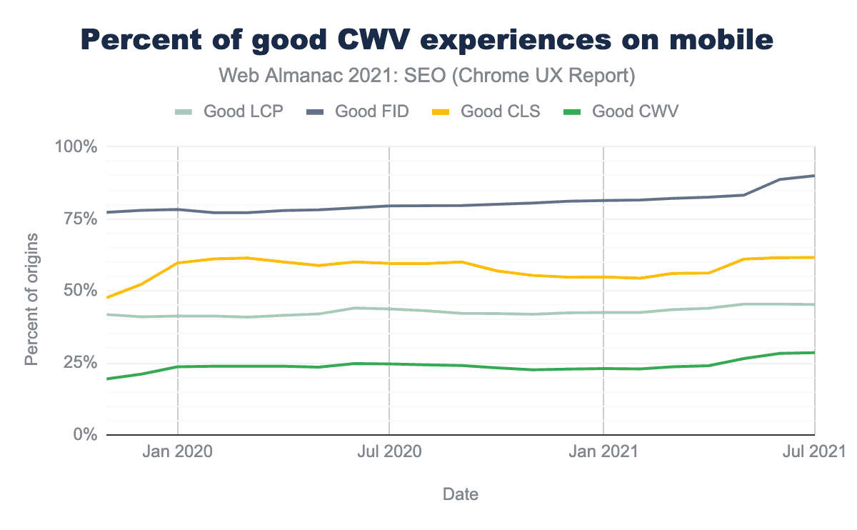 モバイルサイトの29%がコアウェブバイタルの基準値をクリアしており、昨年の20%から増加しています。ほとんどのWebサイトがFIDをクリアしていますが、WebサイトのオーナーはCLSとLCPの改善に苦戦しているようです。このトピックについては、パフォーマンスの章を参照してください。