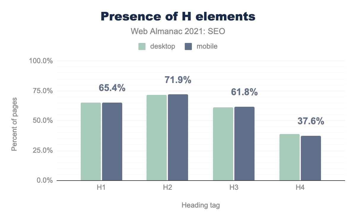 h1の見出しは65.4%のページに、h2は71.9%のページにもっとも多く、h33は61.8%のページに、h4の見出しは37.6%のページに見受けられた。主な見出しについては、 h1(65.4%)よりも多くのページ(71.9%)にh2があります。この差に明確な説明はありません。デスクトップとモバイルのページの61.4%は h3 を使い、h4 は39%以下です。