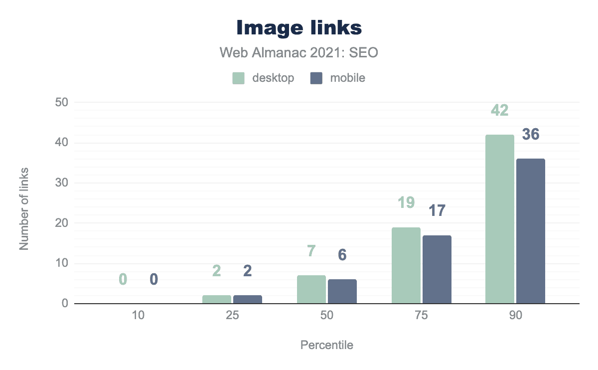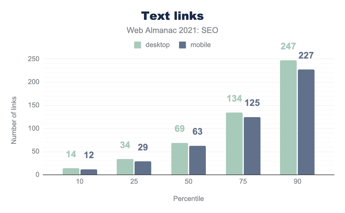 このデータによると、デスクトップの内部リンク数の中央値はモバイルよりも16%多く、それぞれ64対55となっています。これは、開発者が小さい画面でも使いやすいように、モバイルではナビゲーションメニューやフッターを最小限にする傾向があるためと思われます。