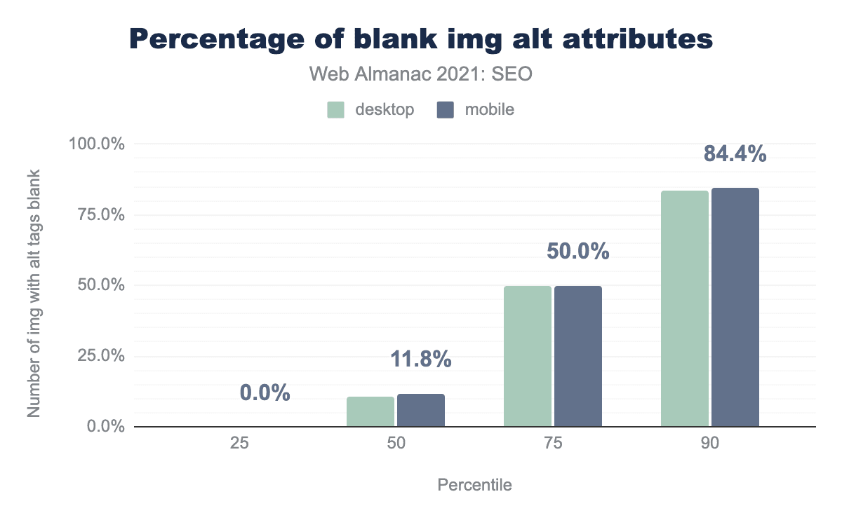 alt属性がフィーチャーされる割合を示す棒グラフ。中央のウェブページでは、デスクトップで10.5%、モバイルでは11.8%の空白のalt属性が表示されています。alt 属性が空白の割合。