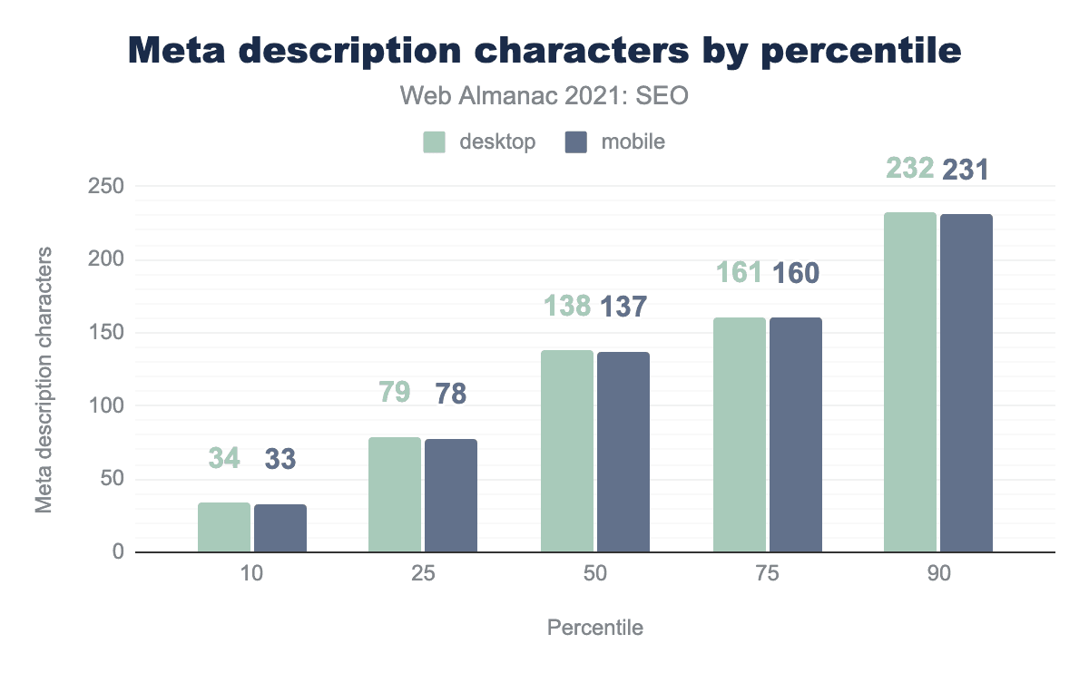 <meta name="description>タグ文字数の中央値は、それぞれ138文字と127文字でした。 - デスクトップとモバイルのページの10%に、35語を含む