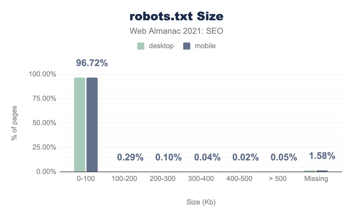 ほとんどのrobots.txtファイルは0~100kbの間でかなり小さいです。しかし、Googleの最大制限を超える500キロバイトを超えるrobots.txtファイルを持っている3,000以上のドメインを発見しました。このサイズ制限を超えたルールは無視されます。