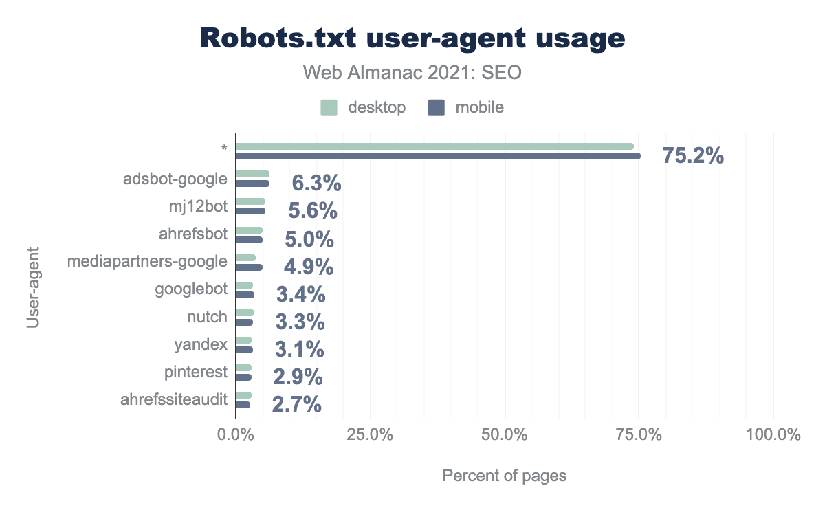 adsbot-google 6.3%、mj12bot 5.6%、ahrefsbot 5.0%、mediapartners-google 4.9%、googlebot 3.4%、nutch 3.3%、yandex 3.1%、pinterest 2.9%、ahrefssiteaudit 2.7%であることがわかりました。robots.txt のユーザーエージェント使用状況。