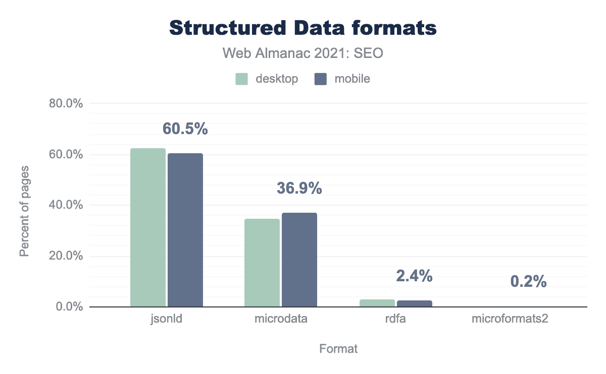 構造化データの導入は昨年より少し増えている。2020年の30.6%に対し、2021年は33.2%のページで使用されています。