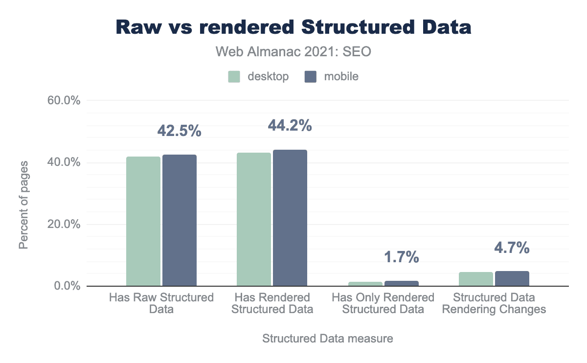 モバイルページの42.5%、デスクトップページの41.8%が、HTML内に構造化データを有しています。モバイルページの4.7%、デスクトップページの4.5%で、JavaScriptが構造化データを修正しています。