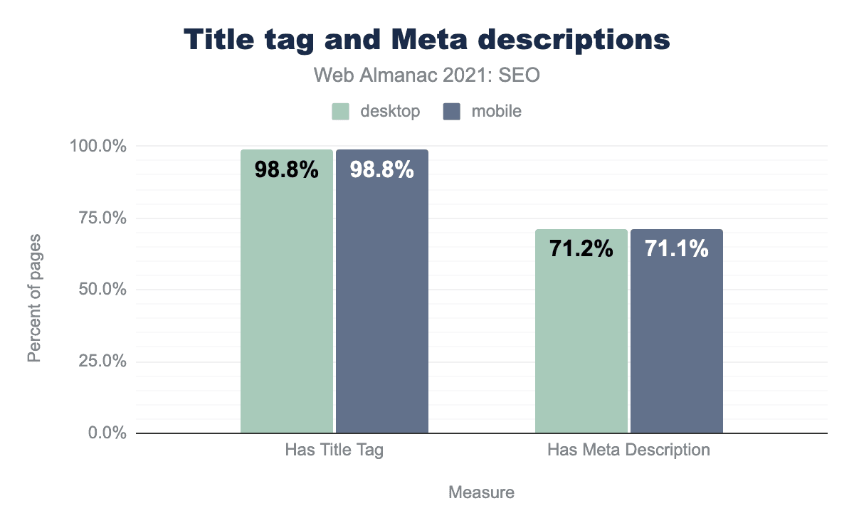title要素があり、モバイルページとデスクトップページの71.1%にメタ記述がありました。2021年、デスクトップとモバイルのページの98.8%が <title> 要素を持っていた。デスクトップとモバイルのホームページの71.1%が <meta name="description"> タグを持っていました。