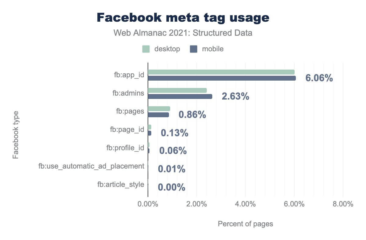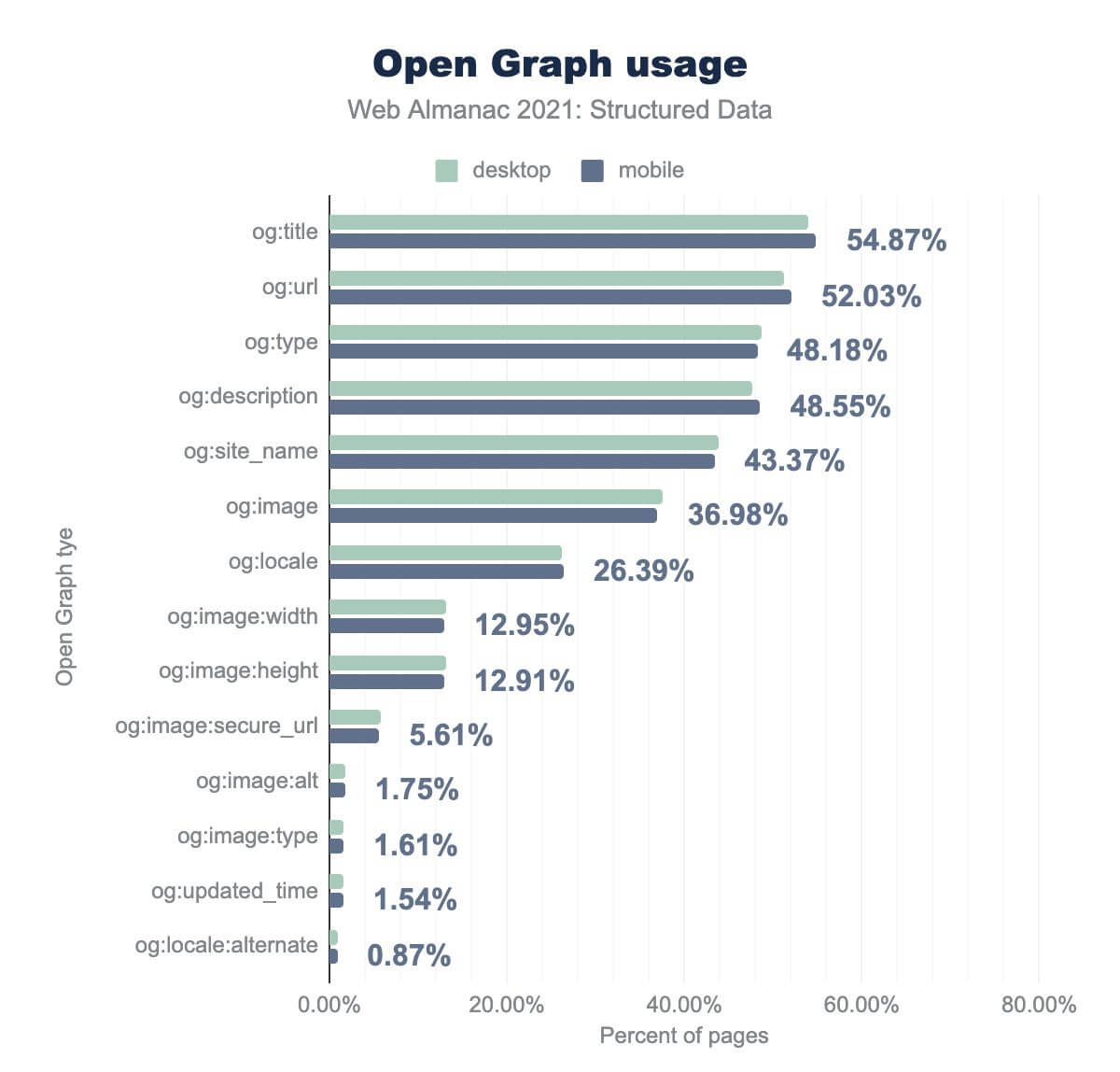 さらに少ないのは、og:imageタグに関するより具体的なメタデータで、og:image:width(12.95%のページ)、og:image:height(12.91%のページ)、 og:image:secure_url(5.61% のページ)と og:image:alt(1.75% のページ)の形式です。 HTTPSの採用がますます一般的になっている現在、og:image:secure_urlog:imagehttpsバージョンを識別するためのもの)はほとんど冗長になっていることは注目に値します。