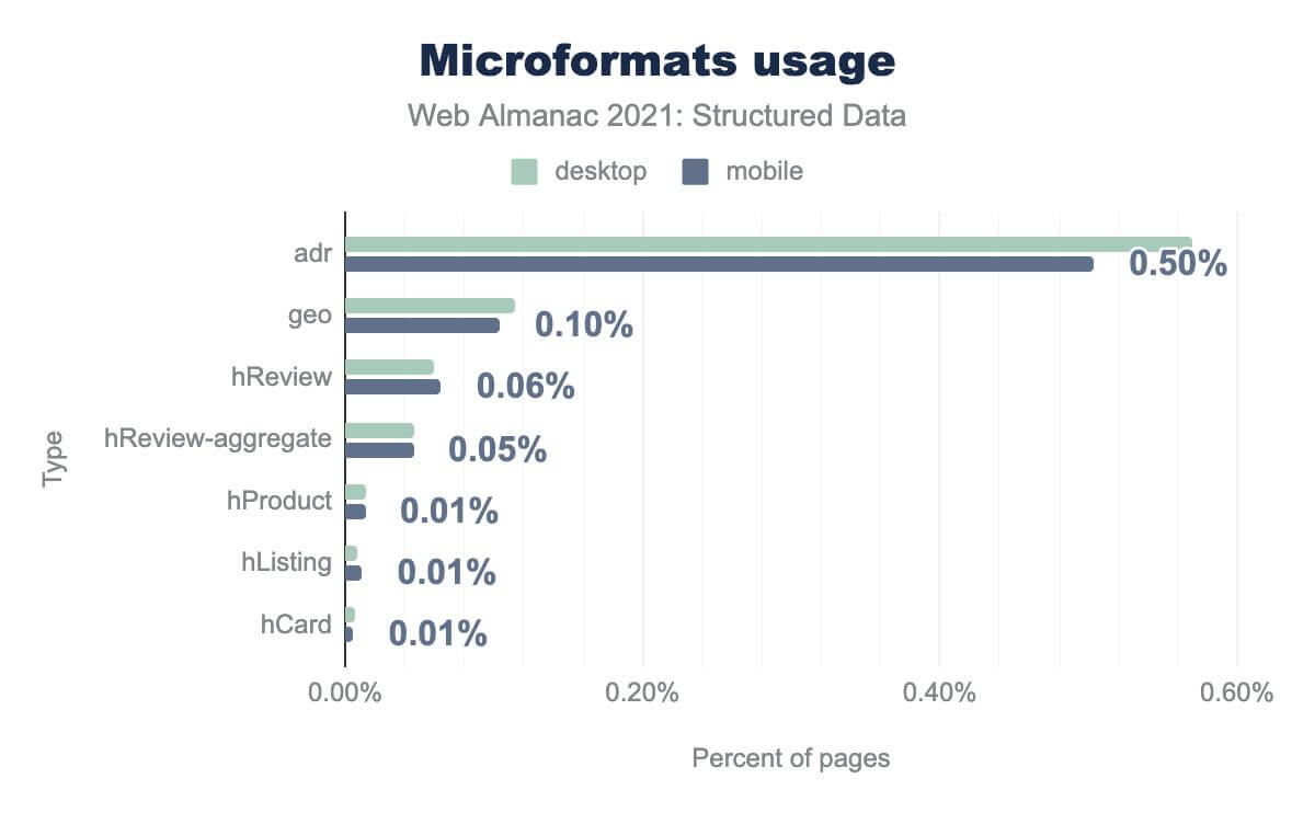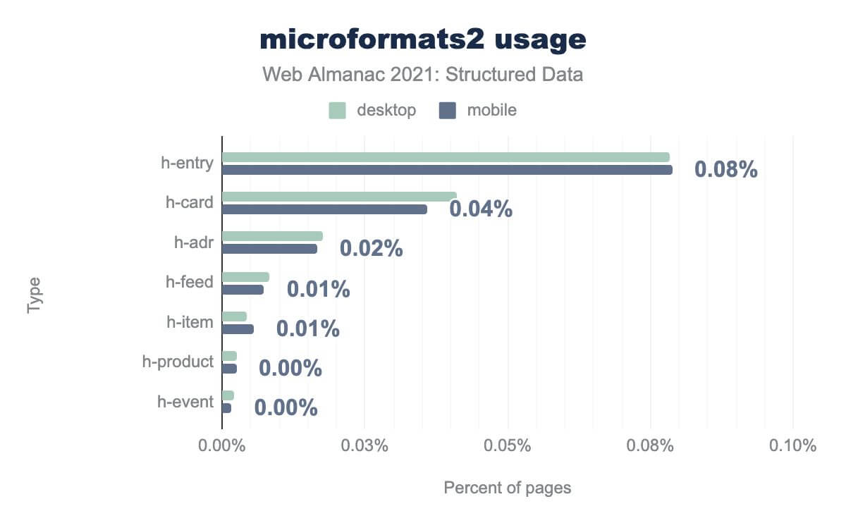 一方、Microformatsmicroformats2などのレガシーフォーマットは、ページの1%未満にしか表示されません。