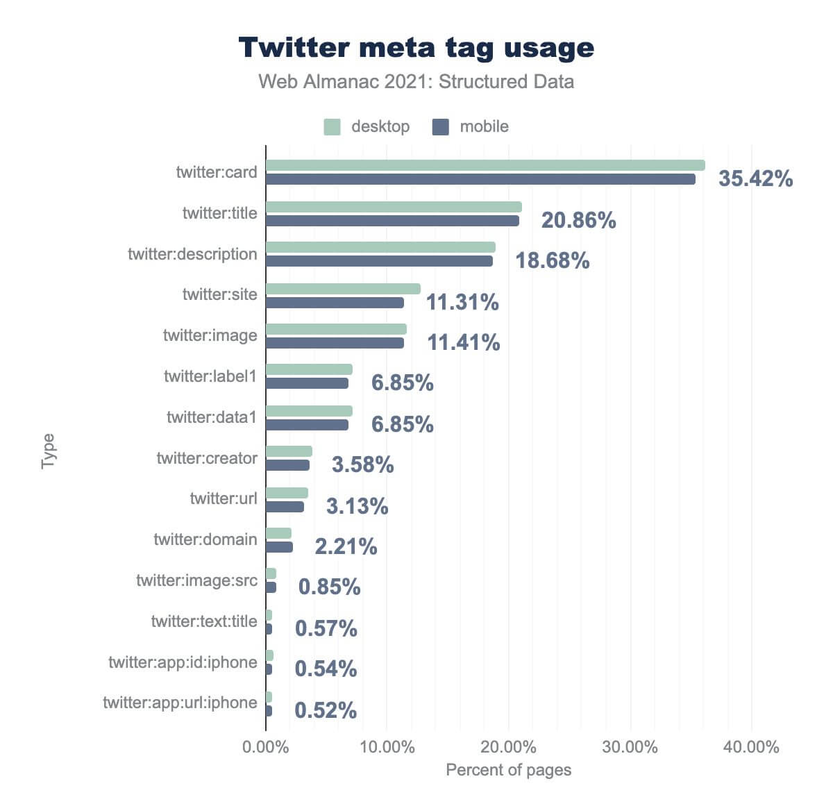 もっとも一般的なTwitterのメタタグはtwitter:cardで、全ページの35.42%に見られました。このタグは、プラットフォームで共有される際のページの表示方法を定義するために使用できます(例:summary、メディアオブジェクトに関する追加データと組み合わせた場合のplayerなど)。