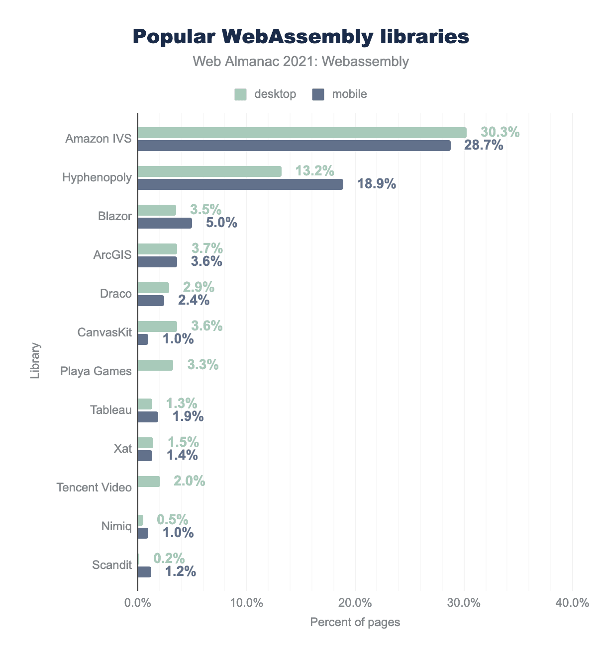 デスクトップとモバイルのトップ10リストにある他のライブラリは、それぞれWebAssemblyリクエストの最大5%を占めています。上記のライブラリの完全なリストと、推測されるツールチェーン、および詳細情報を含む対応するホームページへのリンクはこちらです。