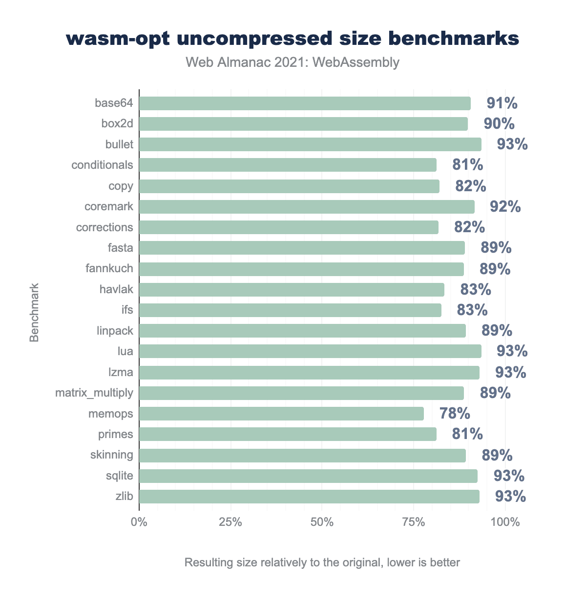 base64、box2d、lua、sqlite、zlib など、さまざまな実世界のモジュールにおける wasm-opt サイズベンチマークを示す棒グラフです。結果として得られるサイズは、元のサイズの78%から、最悪の場合93%までさまざまである。中央値は89%です。wasm-opt の非圧縮サイズベンチマーク。