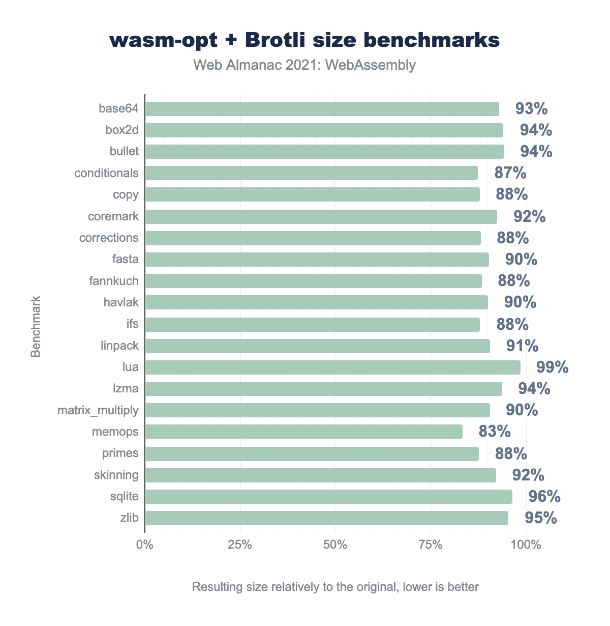 wasm-opt サイズベンチマークを、元のモジュールと結果のWebAssemblyモジュールの両方にBrotli圧縮を適用した場合の棒グラフです。結果は83%から99%の間で変化し、中央値は91%です。wasm-opt + Brotliサイズベンチマーク。