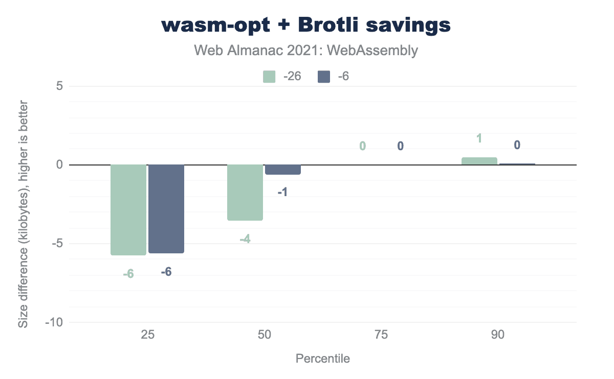 wasm-opt を実行し、今回はBrotliを使用せずに節約した結果を示す棒グラフです。10パーセンタイルと25パーセンタイルでは、デスクトップとモバイルで0キロバイトの改善、または改善なし、中央値では両方で12キロバイトの改善、90パーセンタイルではデスクトップで約100キロバイト、モバイルで45キロバイトの改善が見られました。wasm-opt の節約。