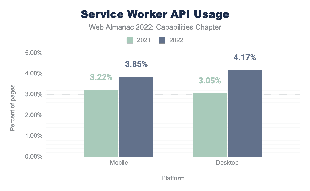 昨年のCapabilities章ではサービスワーカーAPIは測定されていませんでしたが、昨年のPWA章のデータを使用して、APIの使用はデスクトップで3.05%から4.17%へ、モバイルページで3.22%から3.85%へと増加し、デスクトップで六番目に、モバイルで七番目に多く使用される機能となりました。