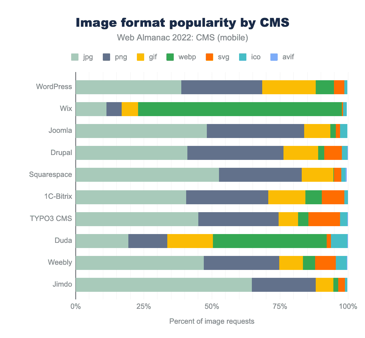 WixとDudaはWebPの使用がもっとも多く、それぞれ約75%と42%の採用率ですが、他はわずかな増加を示しています。