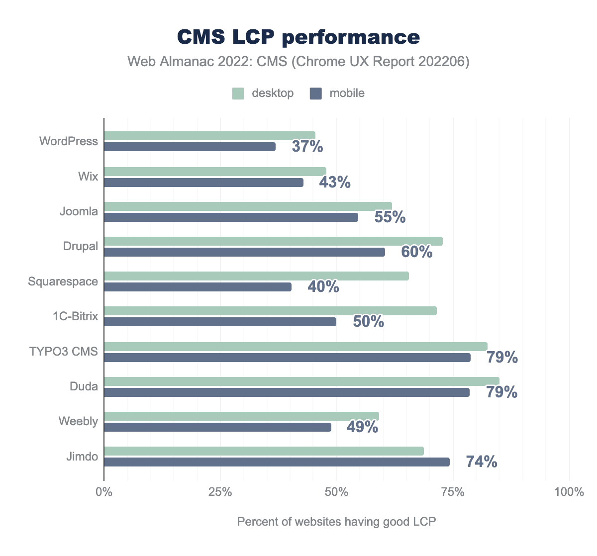 2021年のデータセットと比較して、すべてのCMSはLCPの向上を示しました。Joomlaは13%改善されました。Drupal、Squarespace、TYPO3は10%改善されました。WordPressは9%改善されました。
