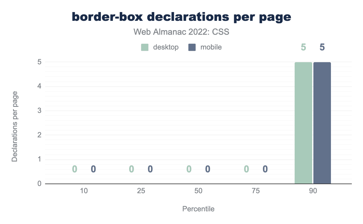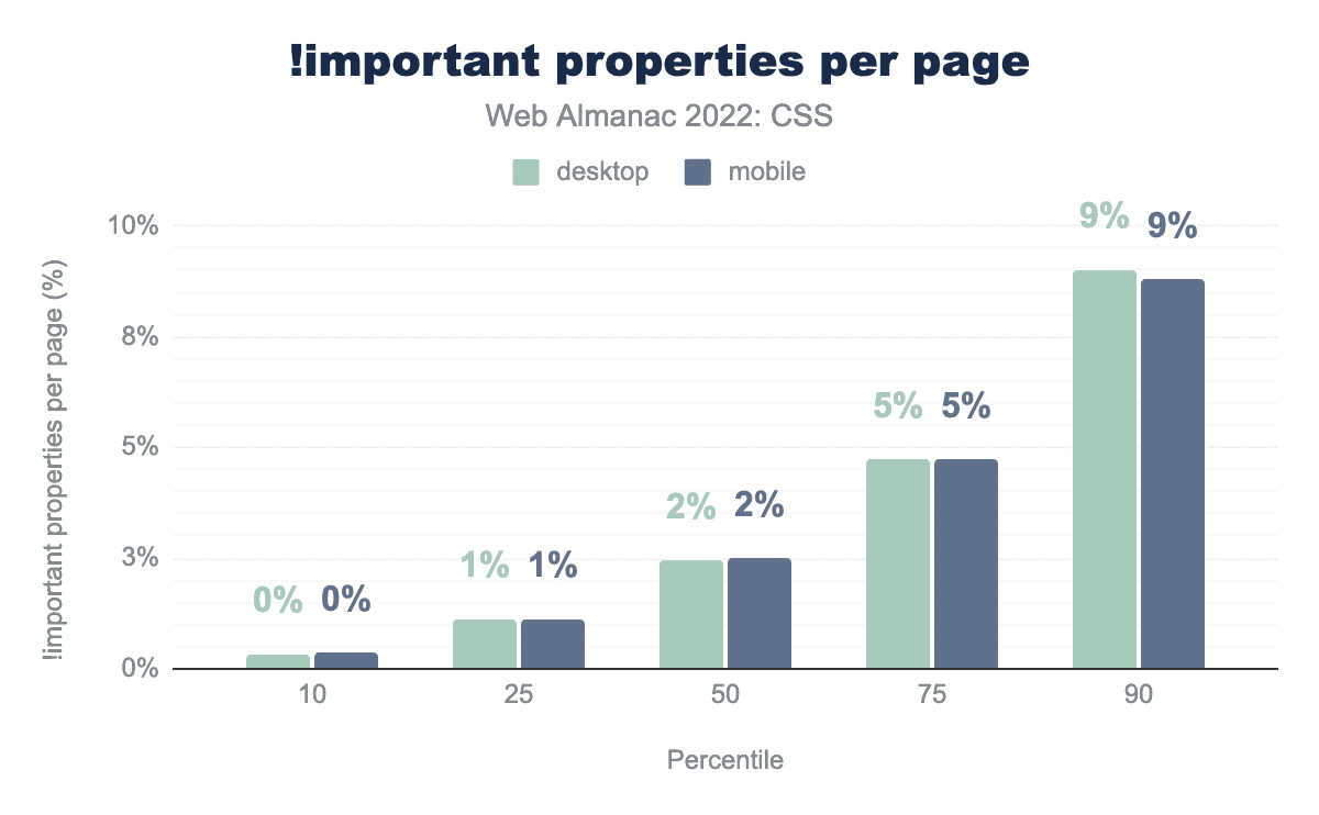 !importantの数の10、25、50、75、90パーセンタイルを示す棒グラフです。モバイルページでは、それぞれ0%、1%、2%、5%、9%となっています。デスクトップの値も同じです。!important プロパティの数の分布。