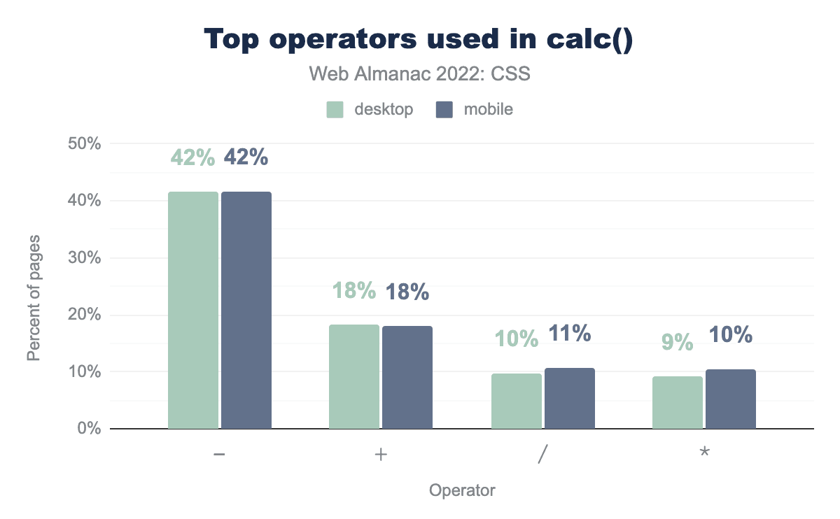 -)が42%、加算演算子(+)が18%、除算演算子(/)が11%、乗算演算子(*)が10%となっています。calc() 関数で使用されるもっとも普及している演算子です。
