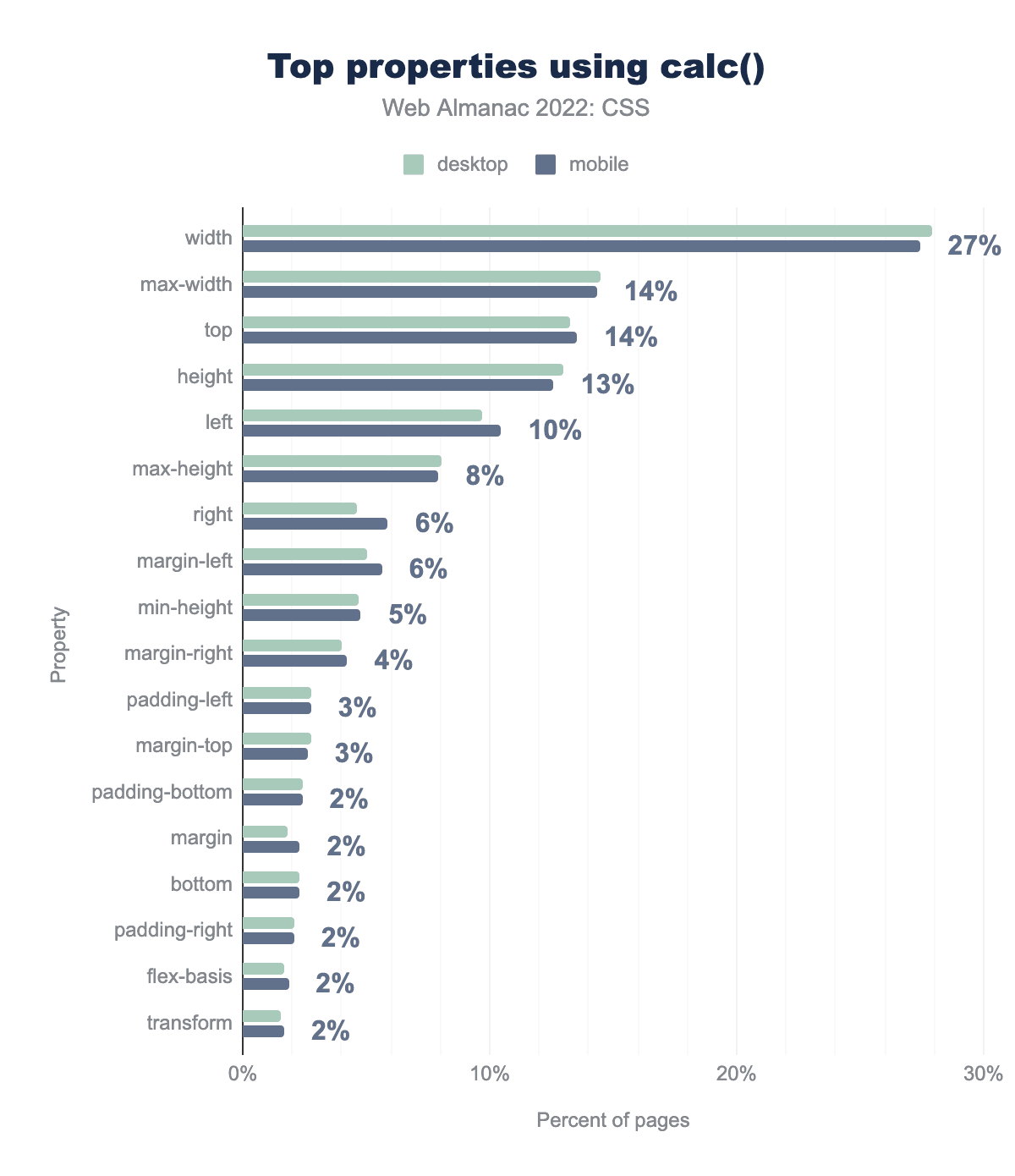 calc()プロパティを示す棒グラフ。もっとも普及しているのはwidthで27%、次いでmax-widthとtopで14%、height 13%、left 10%、max-height 8%、rightとmin-left 6%、min-height 5%、margin-right 4%、padding-left,margin-top 3%、そしてpadding-bottom、minage、bottom、padding-right、flex-basisおよびtransformですべて2%となります。calc()関数を使ったもっとも普及しているプロパティです。