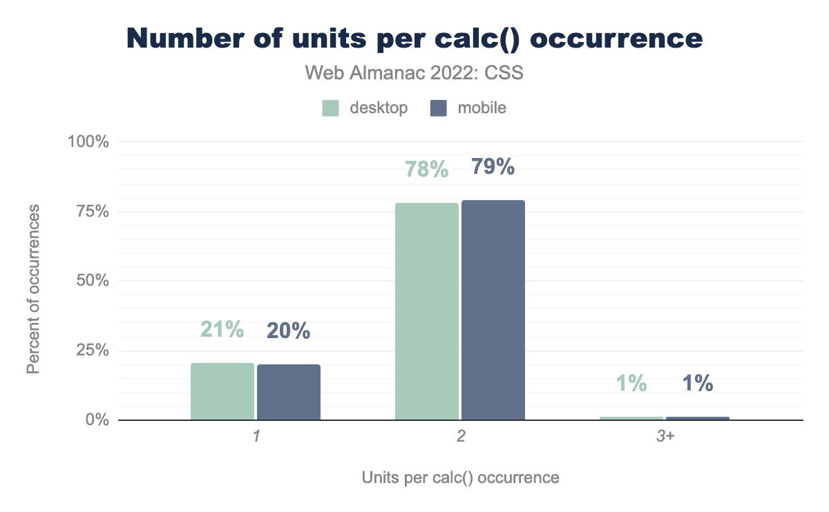 calc()1回あたりの単位数の分布を示す棒グラフ。79%のcalc()が2つのユニットを使用し、次いで20%が1つのユニットを使用しています。3つ以上のユニットを使用するものは1%のみです。calc() の値で使用されるユニークな単位の数。