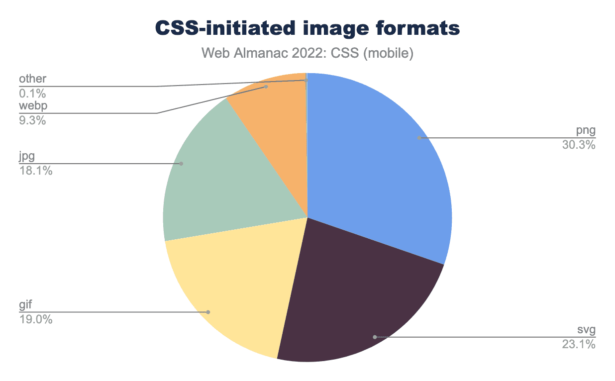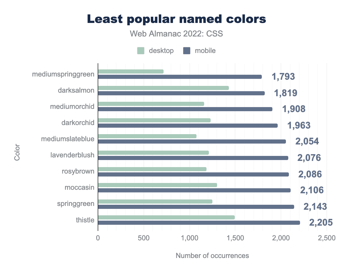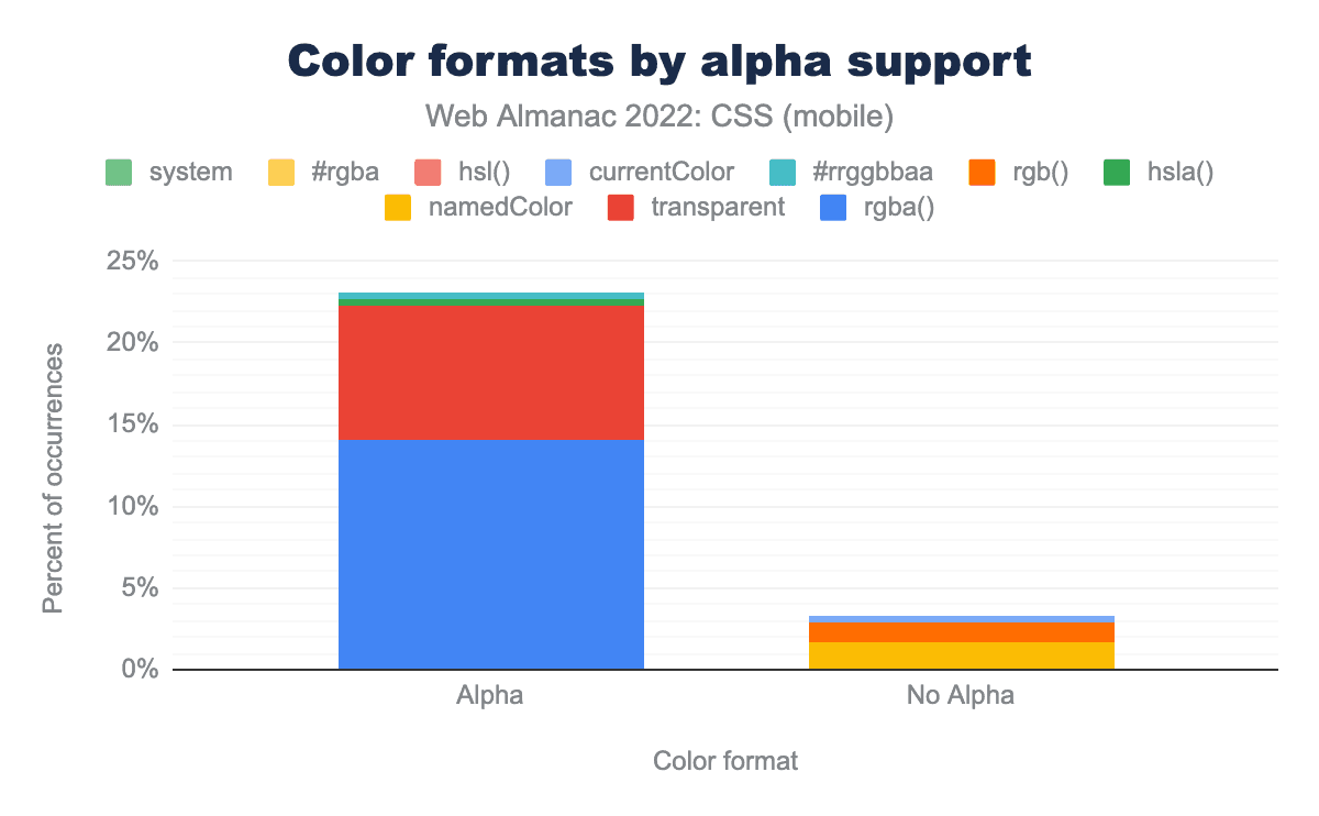 #RRGGBB構文が49%のページ、3桁の#RGBが25%のページ、rgba関数が14%のページ、透明キーワードが8%のページ、名前付きカラーが2%、rgb関数は1%、残りのフォーマットは1%未満のページで使用されており、以下の通りであった。8桁の#RRGGBBAA、hsla関数、currentColorキーワード、4桁の#RGBA、システムカラーキーワード、hsl関数、カラー関数、hwb関数、lch関数、そして最後にlab関数が、人気順に並んでいます。伝統的な6桁の #RRGGBB 構文の使用は2021年以来変わっておらず、色の宣言の半分で使用されています。8桁の #RRGGBBAA 16進法が広く使われているにもかかわらず、rgba() 形式がアルファ成分を追加する方法としてもっとも広く使われているのは、おそらくこれがずっと以前にブラウザへ実装されたからでしょう。