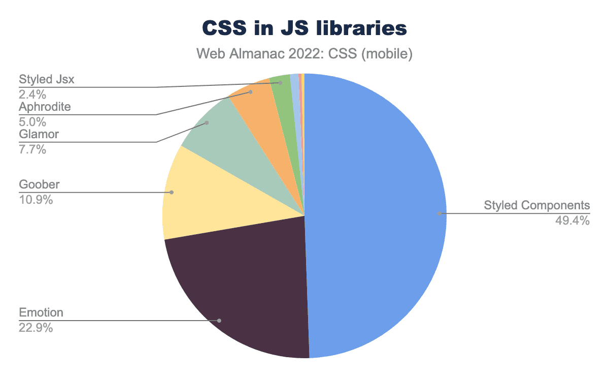 CSS-in-JSの利用は昨年から増えておらず、3%にとどまっています。この利用は、ほとんどがライブラリによるもので、もっとも普及しているのはStyled Componentsです。このライブラリのシェアは57%から49%に低下し、新しいライブラリがほぼ11%でミックスに加わっています。Goober は、自らを「1KB未満のcss-in-jsソリューション」と表現しており、この種のものが好きな人々の間に確実に浸透している。