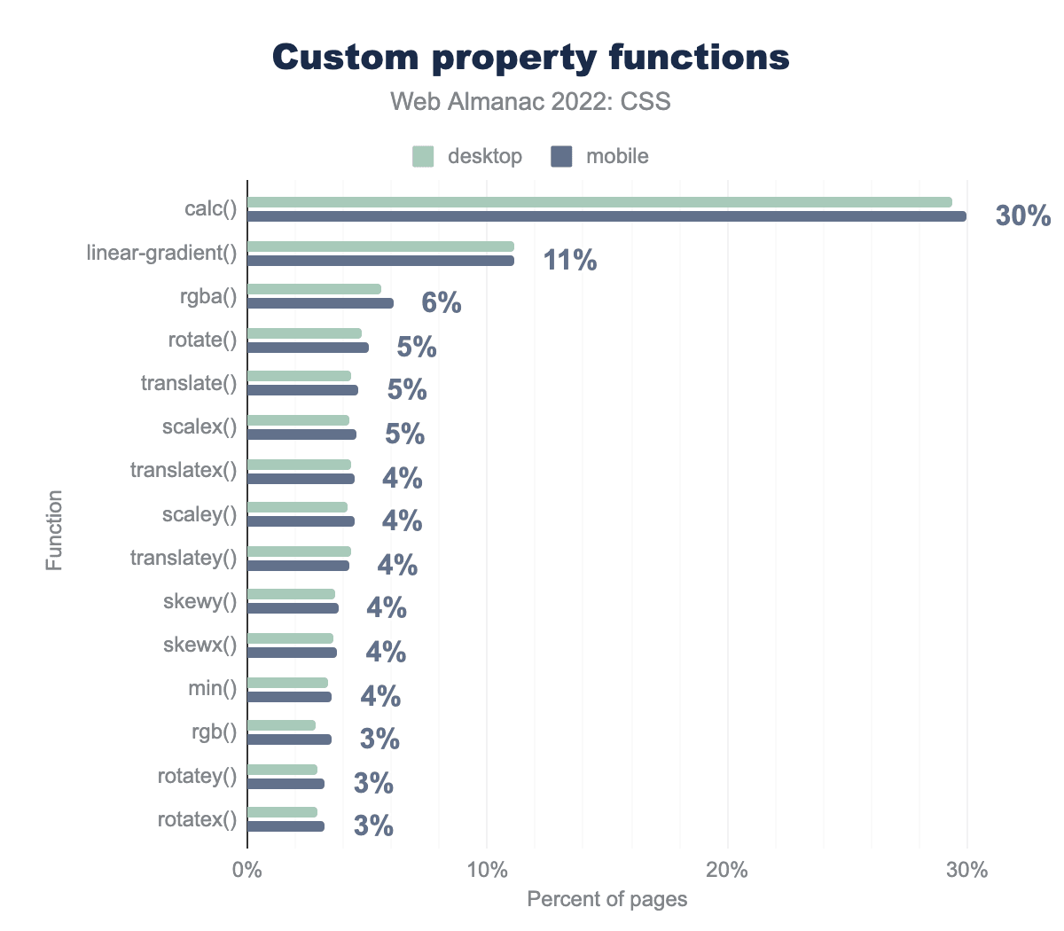 calcで30%のページで使われ、次いでlinear-gradient 11%、rgba 6%、rotate, translate, scaleXが5%、 translateX, scaleY, translateY, skewY, skewX, minは4%、rgb, rotateY, rotateXが3%のページで使用されていることがわかります。カスタムプロパティの値型として calc() が注目され始めていることを見てきましたが、このように使われる関数は圧倒的に多いようです。続いて、linear-gradient()、アルファチャンネル付きのRGBカラー値を設定するための rgba() 関数と続きます。 続いて、トランジションやアニメーションに使われるさまざまな関数があり、この分野でのカスタムプロパティの利用が進んでいることがわかります。