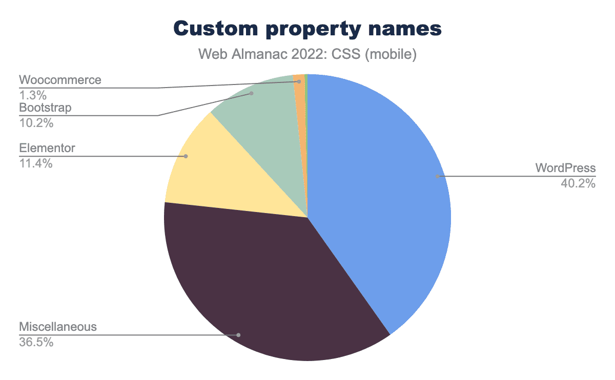 昨年と同様に、WordPressは、もっとも一般的なカスタムプロパティ名のドライバーであり、これらは -wp-* というプレフィックスによって簡単に識別できます。これに続いて、–white``–blueなどの色名が多く、特定の色合いを指定するために使用されています。