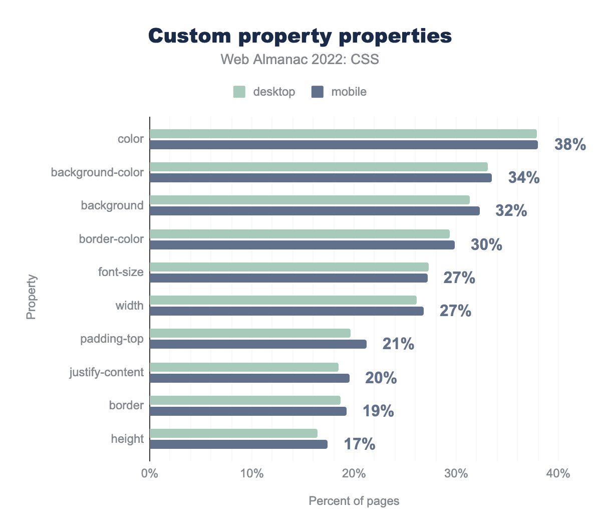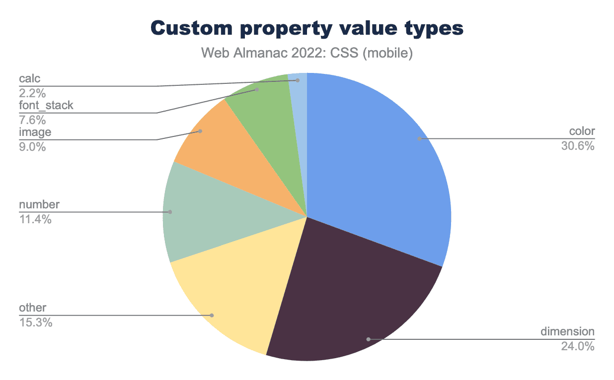 colorプロパティは38%のページでカスタムプロパティが設定され、background-colorが34%、background 32%、border-color 30%、font-sizeとwidthが27%、padding-top 21%、justify-content 20%、border 19%、height 17%で続いています。これらのプロパティを含むページが増える一方で、カスタムプロパティを値として持つプロパティは昨年とほぼ同じ順位で推移しています。カスタムプロパティは color に使用されることが多いようです。当然のことながら、カラースキームの作成はこの機能の明らかな使用法です。しかしvar()関数を使ってfont-sizeを設定することは、リストの10位から5位になり、justify-contentのalignment値を設定することは、トップ10に移動しました。2021年にはモバイルページの5%、デスクトップページの4%がこのアライメント値を設定するためにカスタムプロパティを使用していましたが、これが20%に跳ね上がりました。データから、この増加の一部はWordPressの使用によるものであるように見えます。たとえば、5%のページが -navigation-layout-justify カスタムプロパティを使用しています。